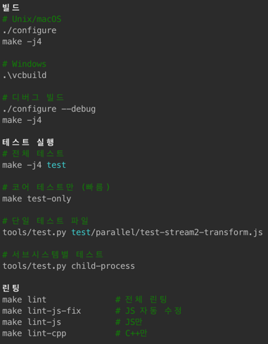 처음 직접 빌드한 Node.js를 실행했을 때, 테스트 코드가 정상 동작하는 것을 보고 꽤 뿌듯했다.