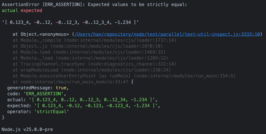 util.inspect에서 numericSeparator 옵션을 켜면, 0과 1 사이의 음수 값에서 부호가 사라지는 현상이 있었다.typescriptimport { inspect } from 'util'; const values = [0.1234, -0.12, -0.123, -0.1234, -1.234]; const text = inspect(values, { numericSeparator: true }); console.log(text); // 기대 출력 [ 0.123_4, -0.12, -0.123, -0.123_4, -1.234 ] // 실제 출력 [ 0.123_4, 0..12, 0..12_3, 0..12_34, -1.234 ]